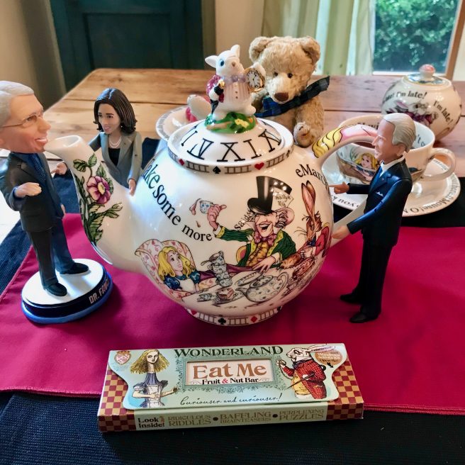 Perfect poem and post for these topsy turvey times. It does feel as if we have fallen down a rabbit hole and through the looking glass. Glad to see you back and have missed your scrumptious tea parties.