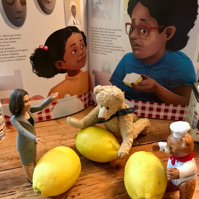 8. OMG, I loved the videos, had no idea that they existed, Jama. And thanks for the shout-out. You know I love this book so no need to put me in the giveaway. I read, loved, then wrote about it, and then read it to the girls & now they have it! What a wonderful thing to have Kamala running with Joe! And what a wonderful thing for all young girls! About six weeks left. . . Whew, I am excited & nervous! It’s a marvelous review, Jama. You should send it to Nikki, Laura, & Kamala! And, my son’s favorite dessert is lemon bars! I’ll need to try this for him! Thanks for all!