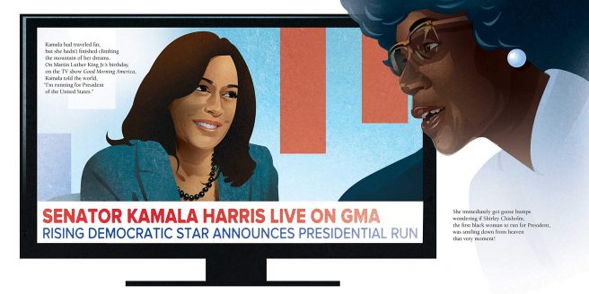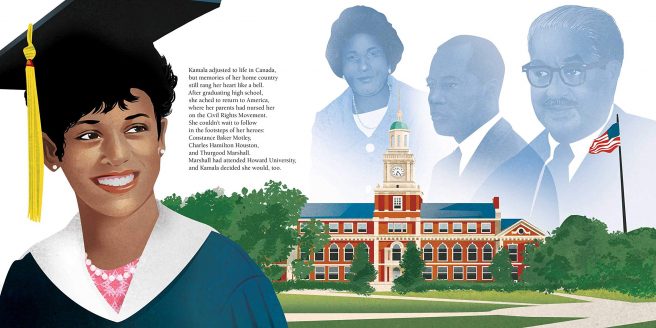 Young readers will especially appreciate the many pages devoted to Kamala’s early formative years: how her Jamaican father met and married her Indian mother in Berkeley before Kamala was born in Oakland, how they took her with them on civil rights marches, where she repeatedly heard words like “freedom,” “justice,” and “peace” even before she understood what they meant.