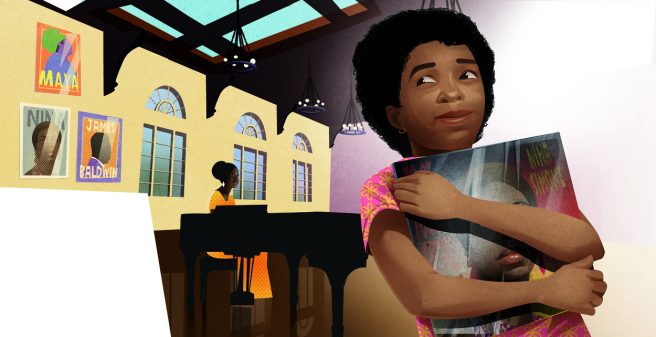 Grimes frames Kamala’s story as a conversation between a black mother and daughter. First grader Eve is upset because a boy in her class called her stupid for wanting to be President when she grows up. Eve’s mom says he’s wrong, and proceeds to tell her all about Kamala, a girl from right there in Oakland who hopes to be President one day.