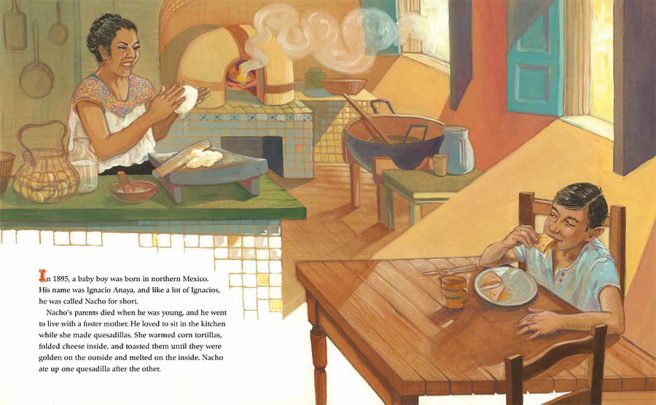 Of course I like peeking in the restaurant kitchen, with its professional equipment, food supplies, and terracotta pottery. The double page spread of Nacho’s nachos shows how three simple ingredients became a worldwide phenomenon.