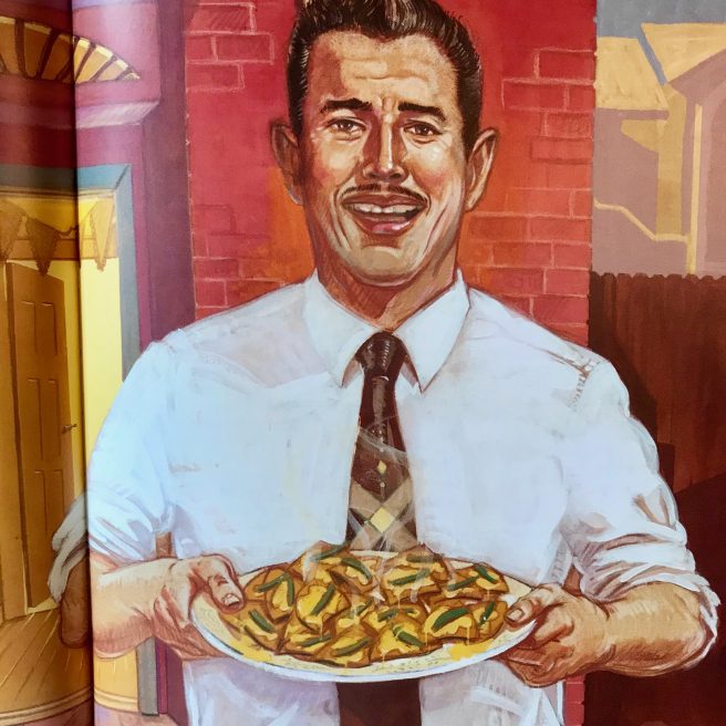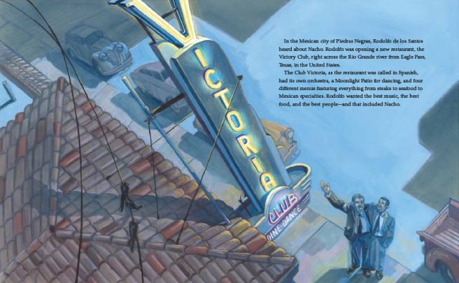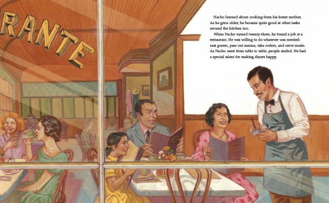 We are delightfully immersed in 1940’s Mexico thanks to Oliver Dominguez’s warm, earth-toned illustrations, rendered in acrylic, gouache, ink and colored pencil. It’s wonderful to see the vintage architecture, cars, fashion, and hairstyles of that era. Restaurant scenes depict people happily gathered for food, drink, and lively conversation, with attentive, genial Nacho nearby. The interior of the Victory Club looks like the type of supper club my in-laws used to talk about frequenting back in their day.