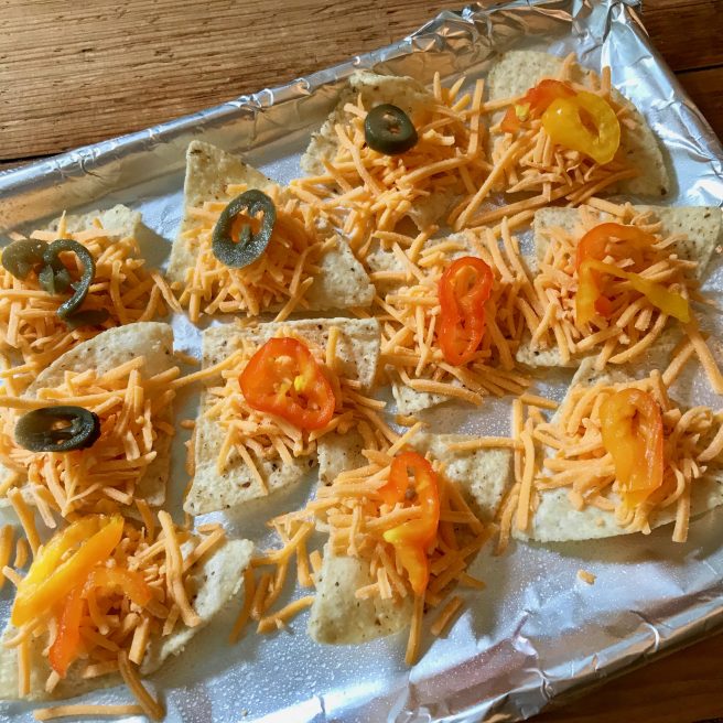- Top each chip with a rounded tablespoon of cheese and one jalapeño strip.