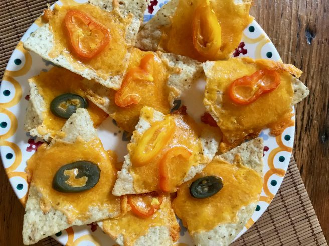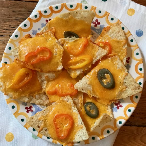 When he spied a bowl of freshly fried corn tortilla pieces, he had an idea. He placed some tortilla pieces on a platter, sprinkled them with Cheddar cheese, then topped each with a pickled jalapeño pepper strip. Remembering his foster mother’s wonderful quesadillas, Nacho warmed everything in the oven till the cheese melted.