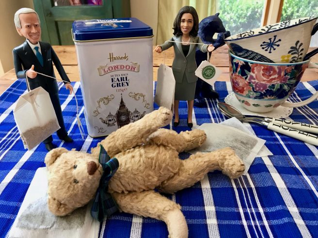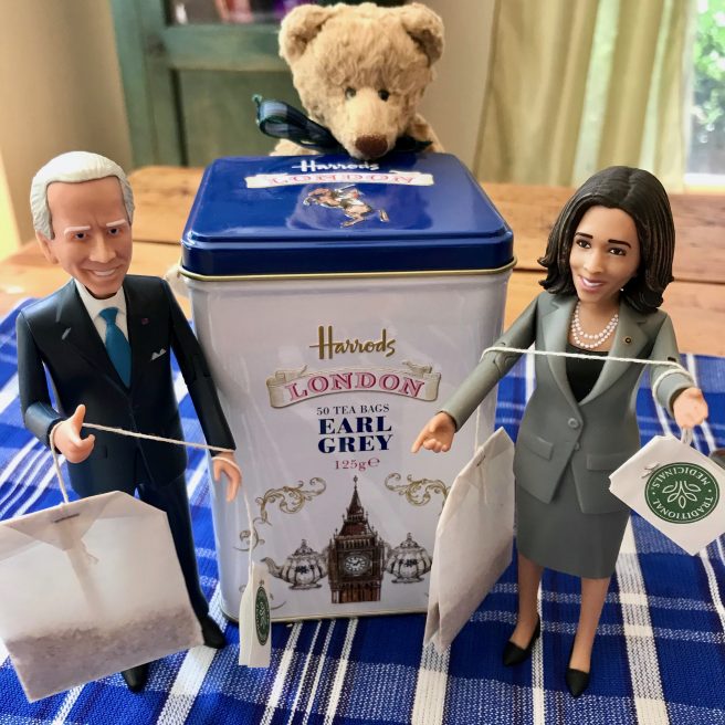 Yes, her morning sounds a lot like mine. I’m trying to drink more water, but my caffeine vice is diet Coke. I know it’s terrible for me, but I enjoy it. Love the poem and your Biden/Harris figures.