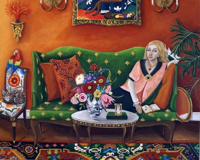 I am especially fond of painted interiors, and love studying Catherine’s rooms, imagining myself reading classic literature amidst stunning tapestries, baroque frames, elegant furniture and interesting objets d’art. The Renaissance influence is pervasive; her paintings have a sumptuous “museum quality” about them with their meticulous composition and aesthetic appeal. Beauty for beauty’s sake. I could get used to living in such opulence. 🙂