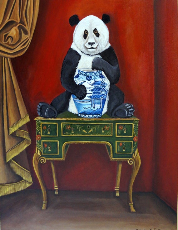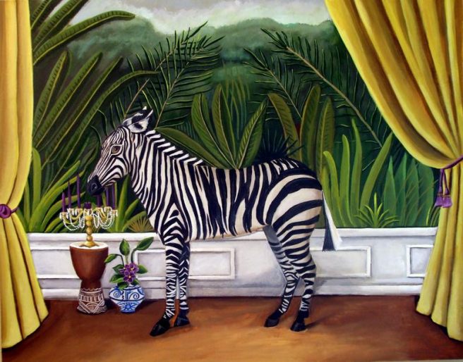 I also like the animals she portrays, whether domestic, wild, or exotic. Lions, rabbits and raccoons seem as much at home in her rooms as poodles, foxes, peacocks, and panda bears. She hasn’t forgotten that welcome touch of whimsy, either. The matter-of-factness of a tiger atop a footstool, a spotted fawn resting on a velvet cushion, a leopard playing hide-and-seek in a dresser, or a zebra showing off a verdant mural to great effect are visual rewards to be savored.