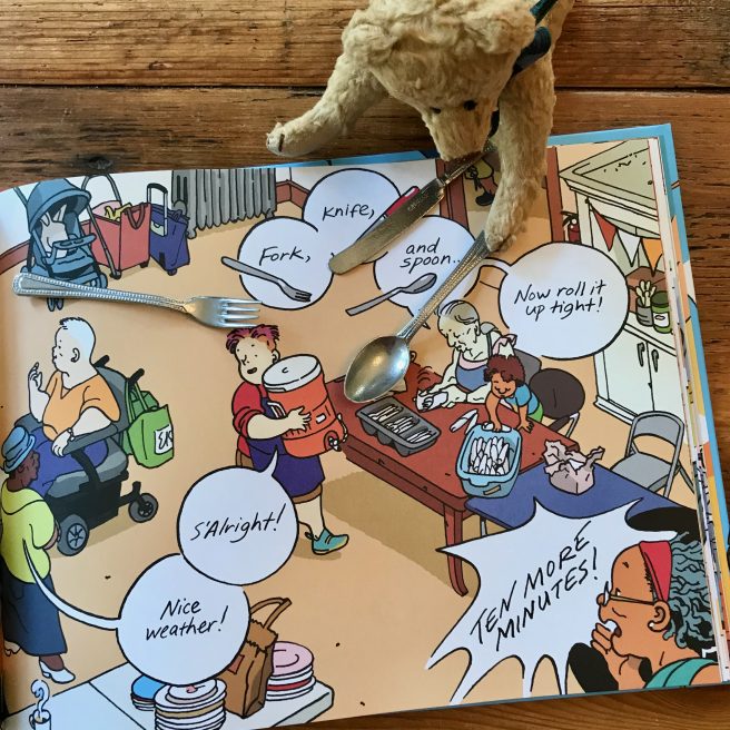 And to top everything off, there’s a sublime double page spread of a young girl lifting a spoon of warm chili to her mouth, with the longest, loudest, most enthusiastic SLURP in the world.