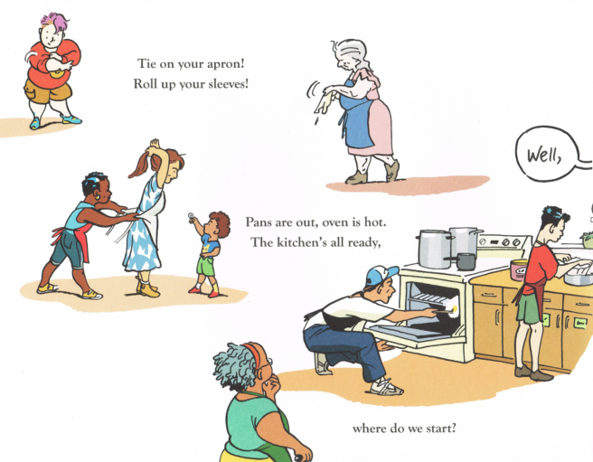 The entire book is a mouthwatering sensory delight that’s sure to stir hunger pangs (steam rising, spices wafting through the air, the scent of cucumbers being chopped, apples peeled, the glug glug of olive oil hitting the pan, onions sizzling).