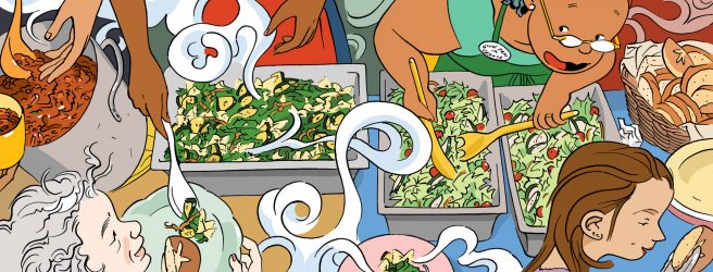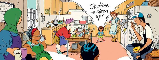 In Our Little Kitchen (Abrams BFYR, 2020), Caldecott honoree Jillian Tamaki takes us inside a bustling community kitchen, where every Wednesday a crew of hardworking volunteers prepares a meal for their neighbors.