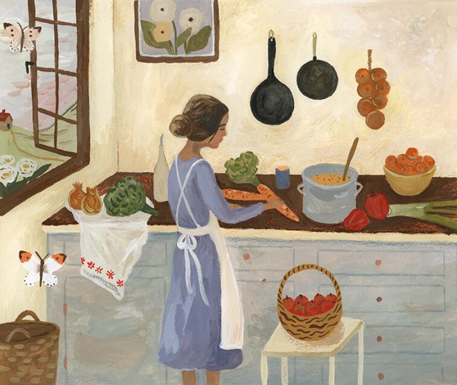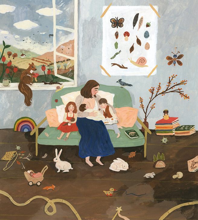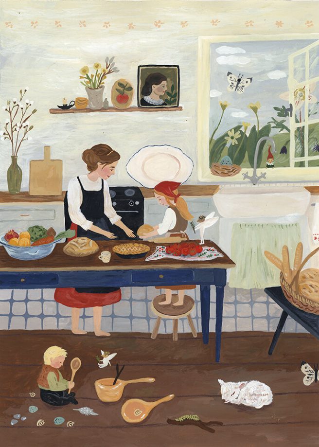 I love the sense of serenity and calm depicted in her domestic scenes, where ordinary activities and family life become a form of meditation. Home is nourishing, pleasurable, and safe — its own world within the world, and her pictures are a good reminder to be fully present in our daily lives. Also cool is that touch of whimsy when the outside comes in. 🙂