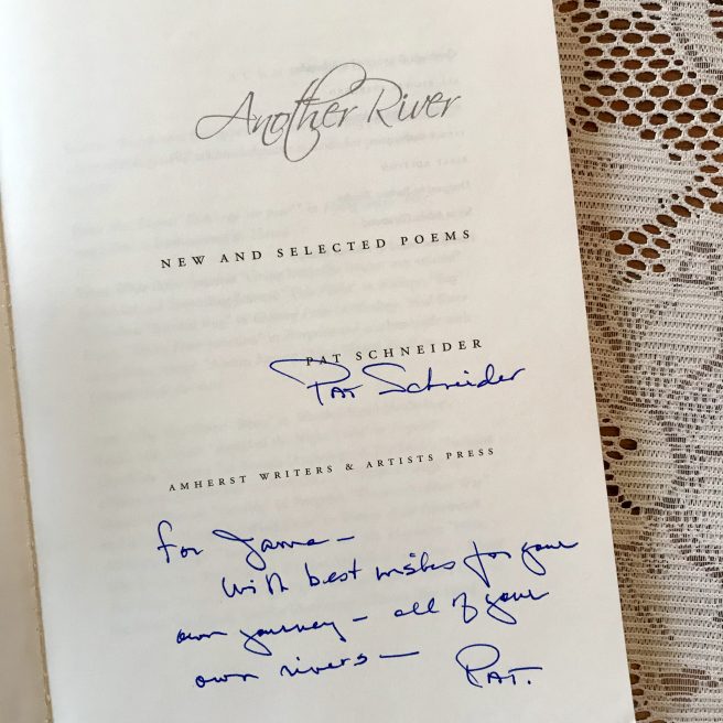 Three years ago, I ordered a signed copy of Pat Schneider’s Another River: New and Collected Poems (2005) via her website. When it arrived, I was surprised to find a note from Pat with a gift copy of her chapbook, The Patience of Ordinary Things (2003).