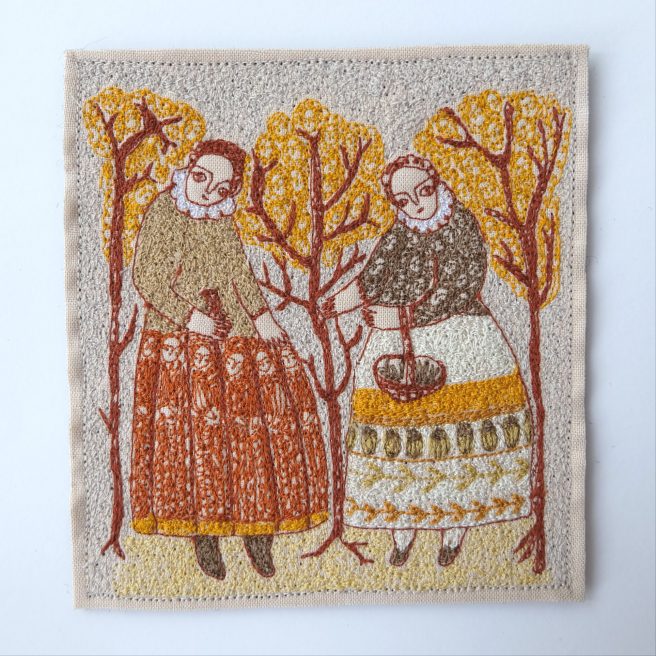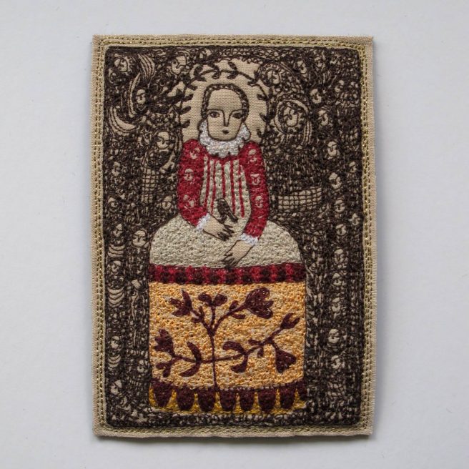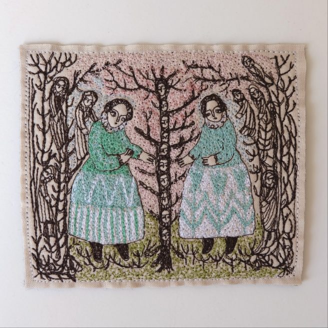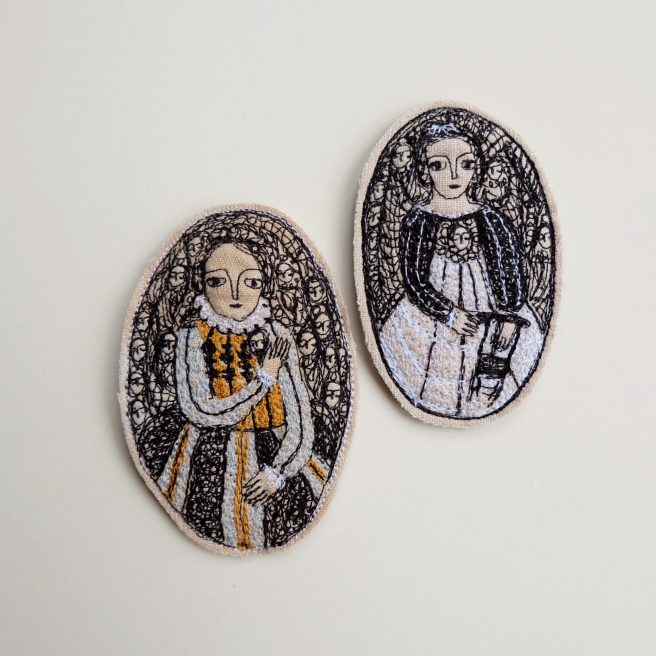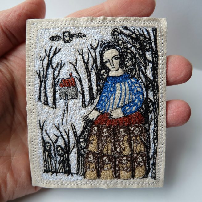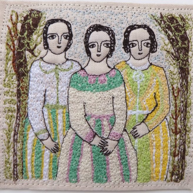 Years ago, she was asked in an interview whom she would most like to invite to a dinner party. Not caring for dinner parties to begin with, she opted for having tea with the two Emilys — Emily Brontë and Emily Dickinson. Come to think of it, upon seeing her embroidered portraits for the first time, I did think of them. 🙂