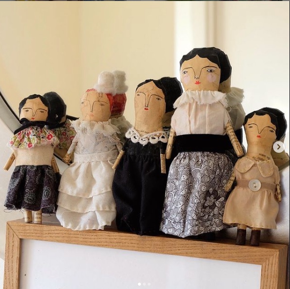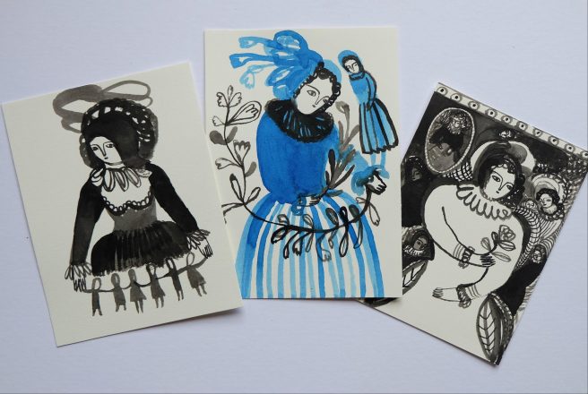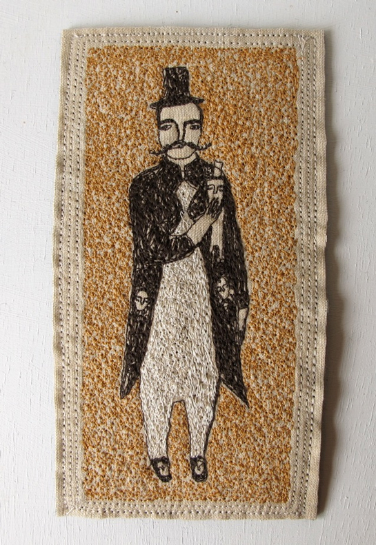 In addition to gouache paintings and embroidered portraits, she makes dolls, paper sculptures, and tiny artist books/zines. She enjoys switching between genres, allowing the muse to dictate. She’s compelled to do something with her hands at all times.
