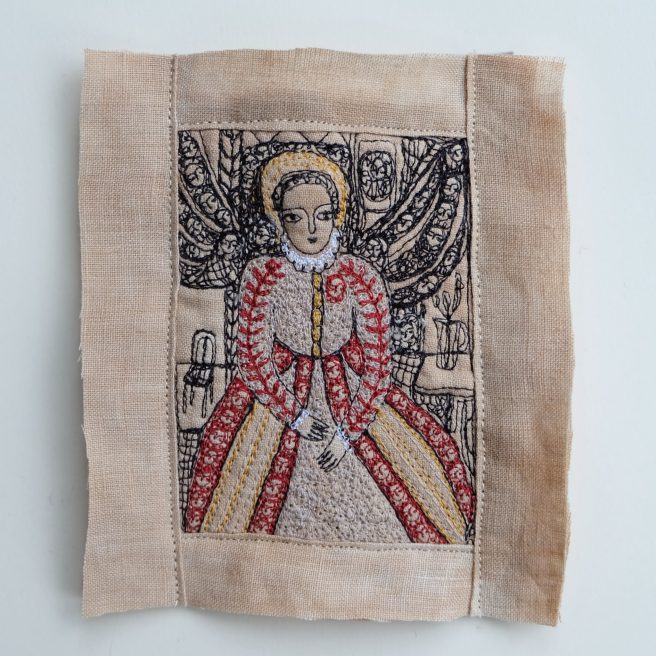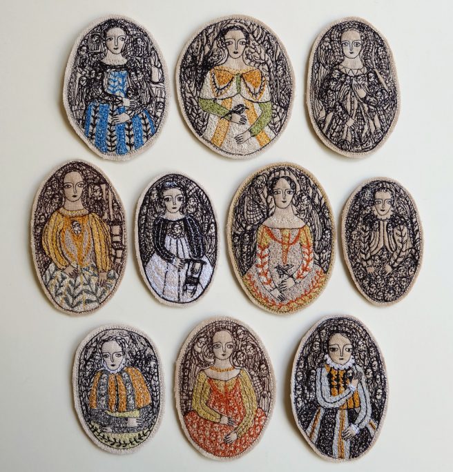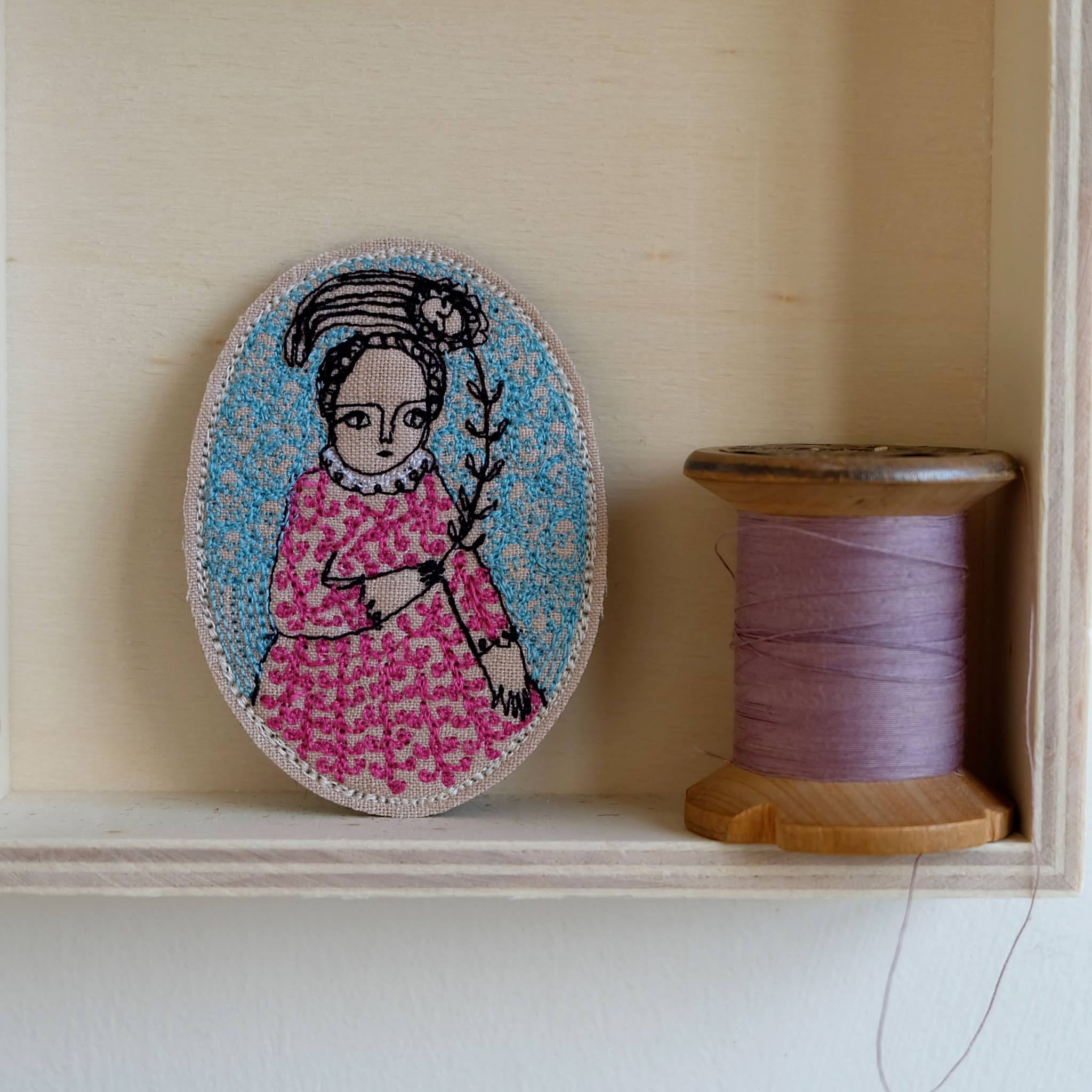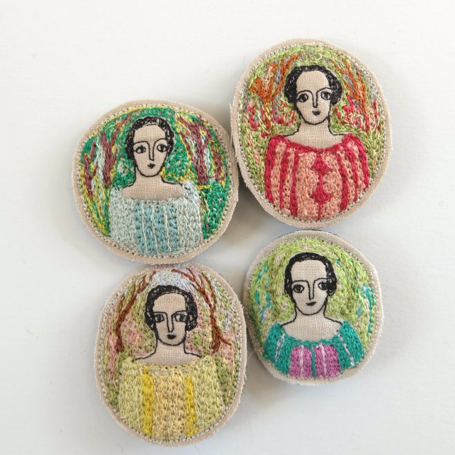 In addition to her gouache paintings, Cathy excels in machine embroidery work. I love her miniature stitched portraits and brooches. Again, women of another time, with high-necked ruffled collars and long skirts, who would seem at home in 19th century parlors or formal gardens.