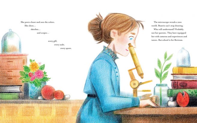But the final spread pretty much sums up this story so well — a still life with a basket of fungi, a framed painting of Peter Rabbit, another of butterflies, and the tools of her trade — pens, brushes, and the trusty microscope that symbolizes Beatrix’s transition from a casual, enthusiastic observer and artist, to a more serious minded naturalist.