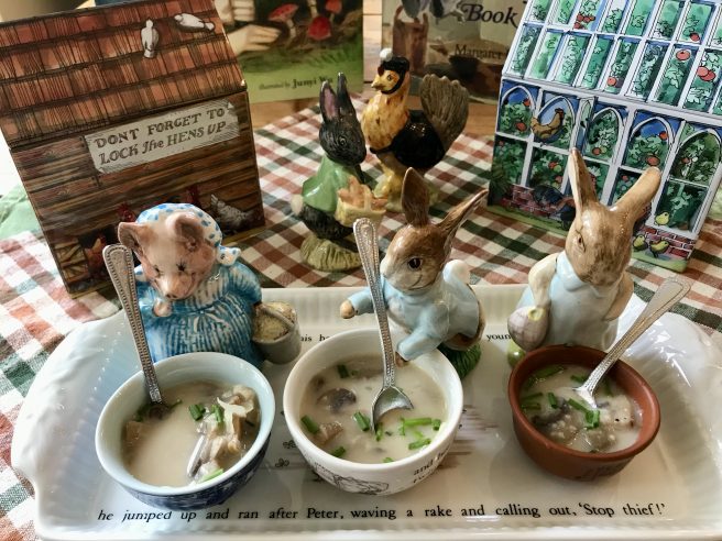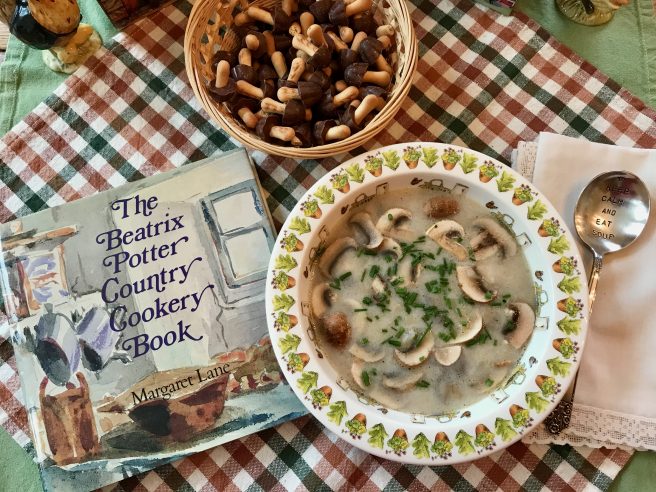 Sautéing the onions and mushrooms in a little butter, then adding several tablespoons of heavy cream at the end makes for a flavorful broth. Peter Rabbit and his friends slurped to their heart’s content, tasting the soup in different bowls just to see whether there was any difference in flavor. All very scientific, of course.