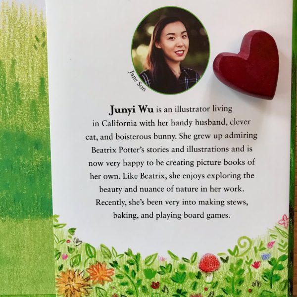 Junyi Wu’s illustrations are gorgeous! They appear to have been done with pastels, which provide not only wonderful texture, but an appealing dreaminess. Love all the shades of green with pink accents, and Beatrix primarily dressed in blue (a nod to Peter’s blue coat?). She didn’t try to replicate Potter’s style, but instead captured her essence — a free spirit prone to whimsy, capable of capturing the beauty and wonder of the natural world.