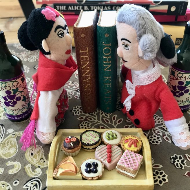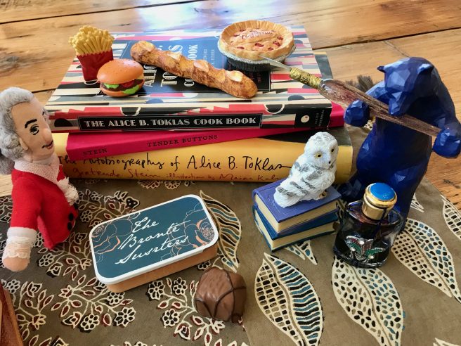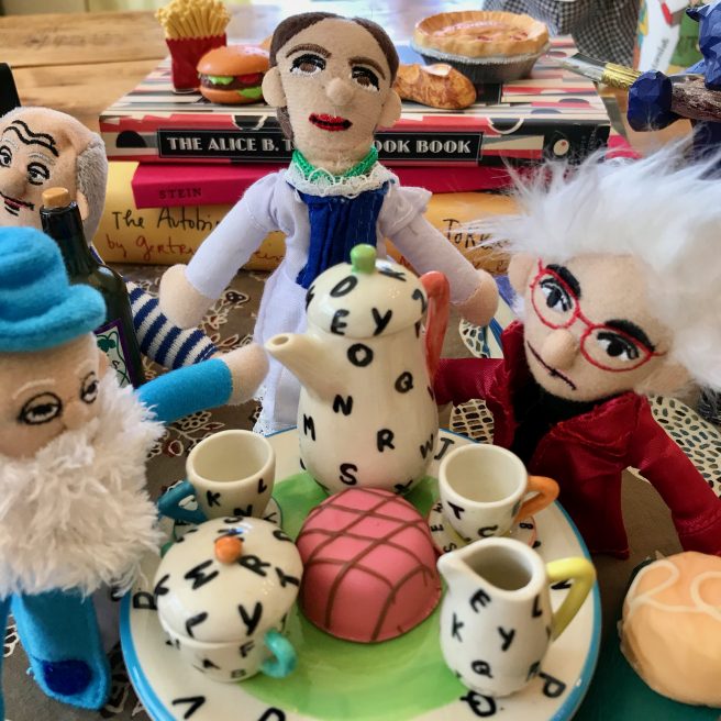Alice B. Toklas might serve her famous Mushroom Sandwiches with Clear Turtle Soup, a lovely Violet Soufflé, and A Fine Fat Pullet, followed by a Tender Tart or even Custard Josephine Baker (what, you were hoping for Haschich Fudge?). 🙂