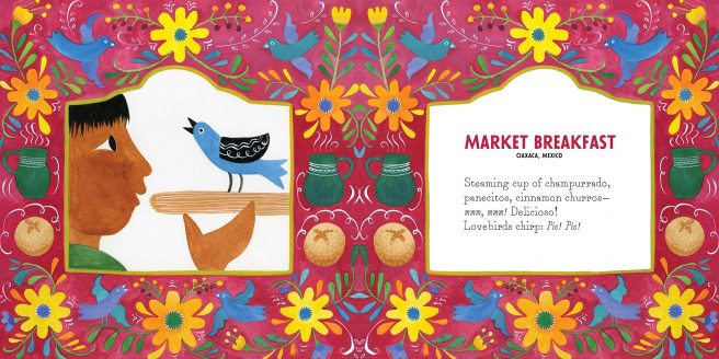 MARKET BREAKFAST Oaxaca, Mexico Steaming cup of champurrado, panecitos, cinnamon churros -- mmm, mmm! Delicioso! Lovebirds chirp: Pio! Pio!