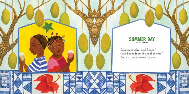 Julie P. invites us to feast with our eyes in a series of colorful, vibrant diptychs — one panel depicting people + food, the other showcasing the text of the poem. These are set against gorgeous folkloric backgrounds embellished with regional and ethnic motifs — a perfect way to capture the flavors of the poems and celebrate cultures.