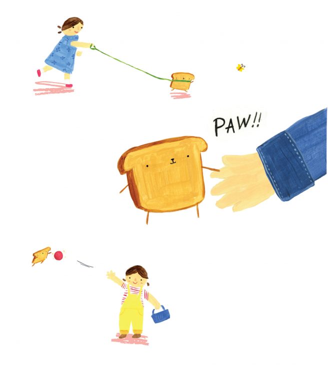 Yip yip hooray! Toasty is just the right breed of bread — the perfect dog for her! They play and play and soon become the best of friends. Toasty is now the toast of the park!
