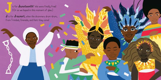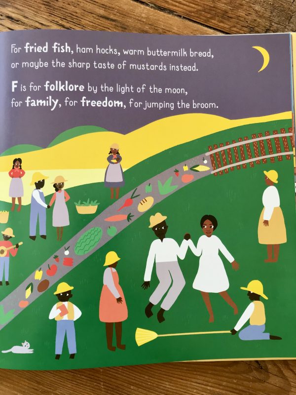 Now, if I absolutely had to choose one letter to capture the book’s essence, perhaps it would be “R,” as it’s rich, radiant, rousing, readable, and resourceful. But that would only begin to describe it, because in addition to being an inventive alphabet book celebrating Black history and culture, it’s also a story of strength, persistence, and resilience, a timely call to action, and a loving praise song of hope, creativity, and pride.