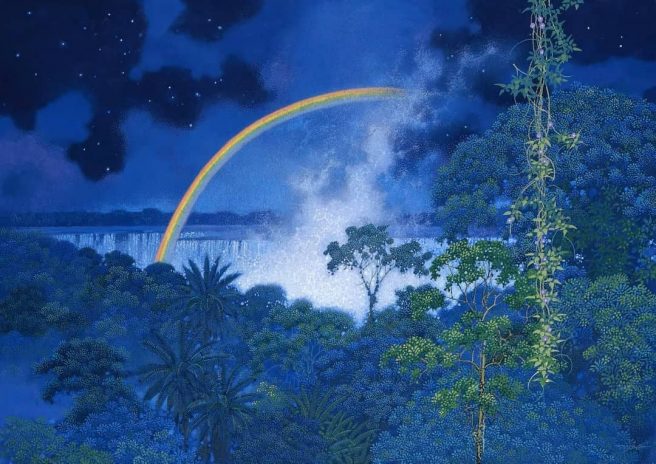Yes, the children changing to “azure” blue, a foretelling in this surreal perhaps end of life blue land, though the poem ends with “as our train got going.” So I guess the train is still on the track… lots of layers there. I love all the blue art images especially “Dreampath,” the blue sky in the beach image on top, and Drew Chial’s luscious blue rose—thanks for this blue escape Jama!