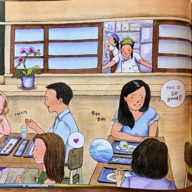 The map of Niki’s travels in Japan, complete with adorable insets of Niki eating octopus balls, ramen, and mochi (my favorite!) and the bullet train tracks moving across the page, is simply fabulous. And how I love Bite 6, showing Niki’s first kaiseki experience — those luscious dishes, the flow of tablecloth to ocean waves, which appear in several more spreads, gradually making their way to the back endpapers.