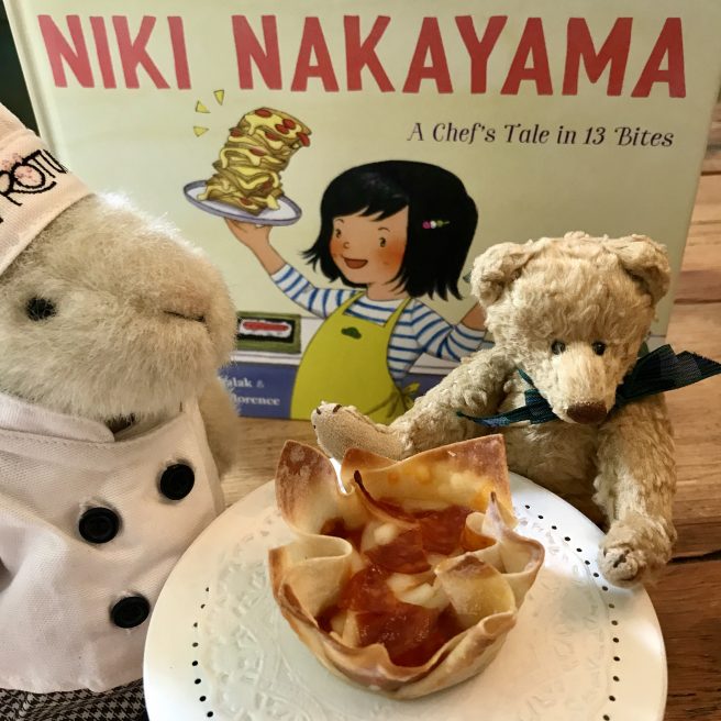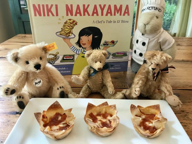 The bear chefs made quick work of it — because it’s a simple recipe yielding maximum payoff. Wanting to emulate Niki’s inventiveness (and because it was a little tricky folding the wonton edges with paws), they made a second batch using a muffin tin. They also added bits of pepperoni and enjoyed their wonton pizzas warm while the cheese was still melty. Yum!!