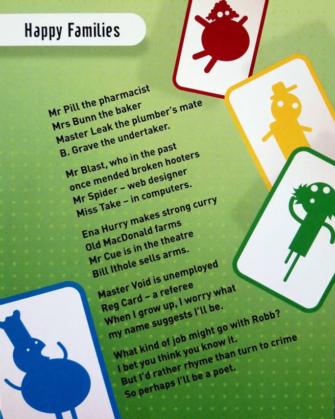In “Happy Families,” MacRae ratchets things up a notch with clever, inventive names that suggest certain occupations (my fave is Mr Spider, web designer). Love how Master Robb the narrator addresses his concerns by proving himself a poet with his verse.