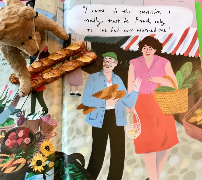 Sarah Green’s vibrant digital illustrations depict Julia in all her statuesque, square-jawed, exuberant, industrious glory. Julia’s energy and joie-de-vivre are palpable, and there are mouthwatering drawings of food in almost every spread. Lobster! Lemon Tarts! Chocolate cake! Crusty baguettes! Mmmmmm. It is hard not to lick the pages. 🙂