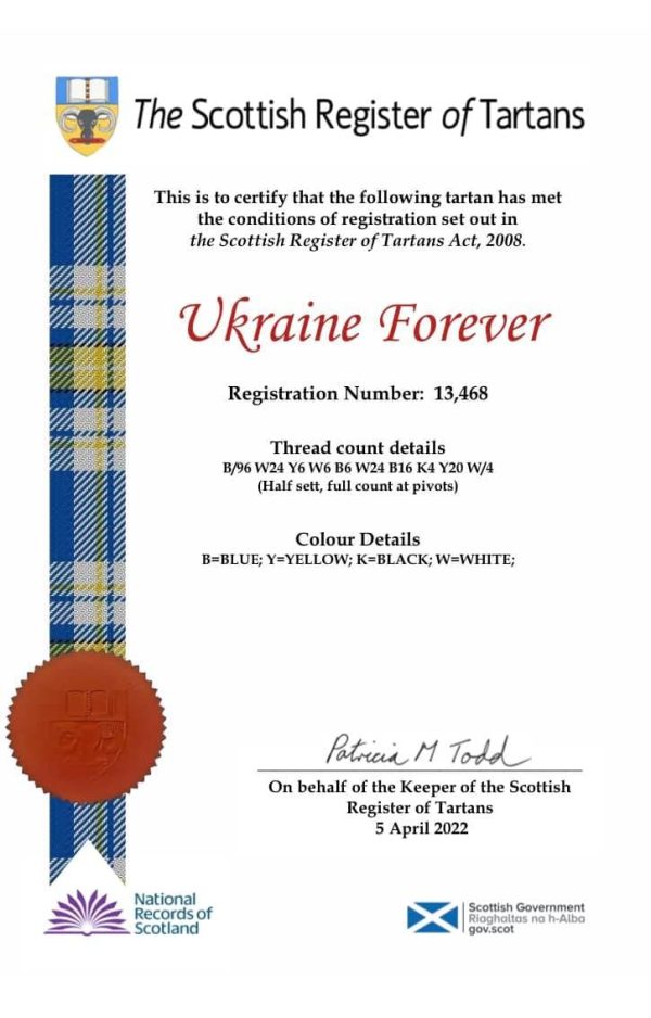 We meticulously and respectfully designed this unique tartan to reflect Scotland’s solidarity with the people of Ukraine; one sovereign nation to another. The simple but bold colour elements of both our country’s flags are fused together. It is a strong and emotive tartan. It will endure.