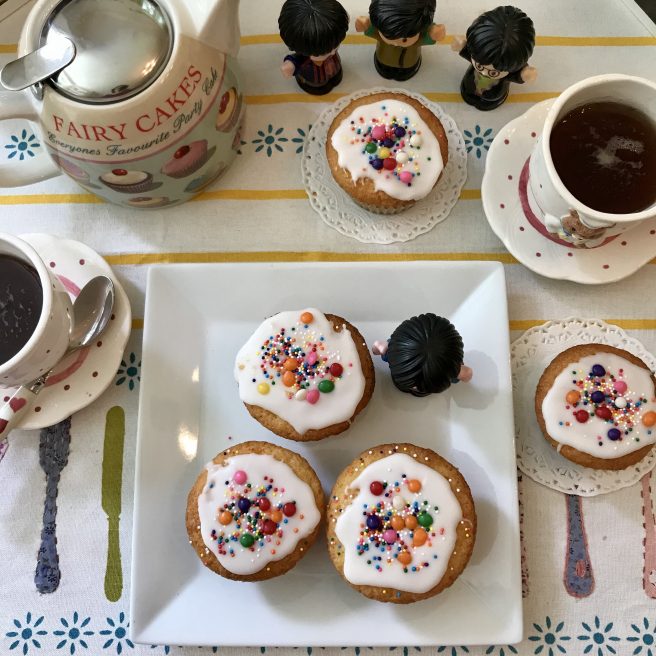We used Mary Berry’s recipe; it was pretty basic as fairy cake recipes go, quick and easy, and something suitable for making with kids (who especially enjoy decorating with sprinkles or candy bits). And yes, she does specify baking at 390 degrees (a first for me).