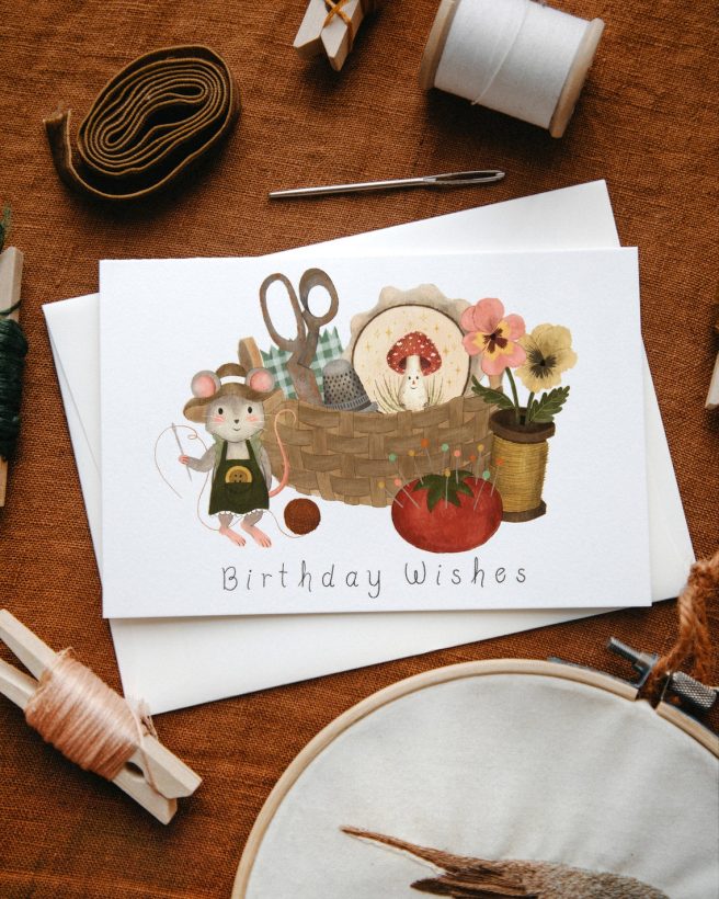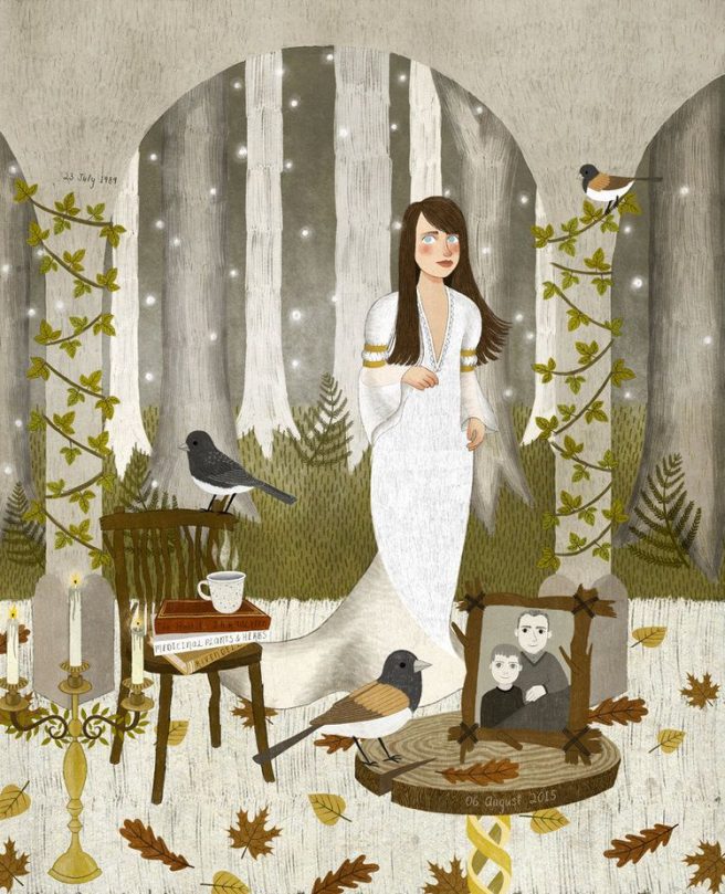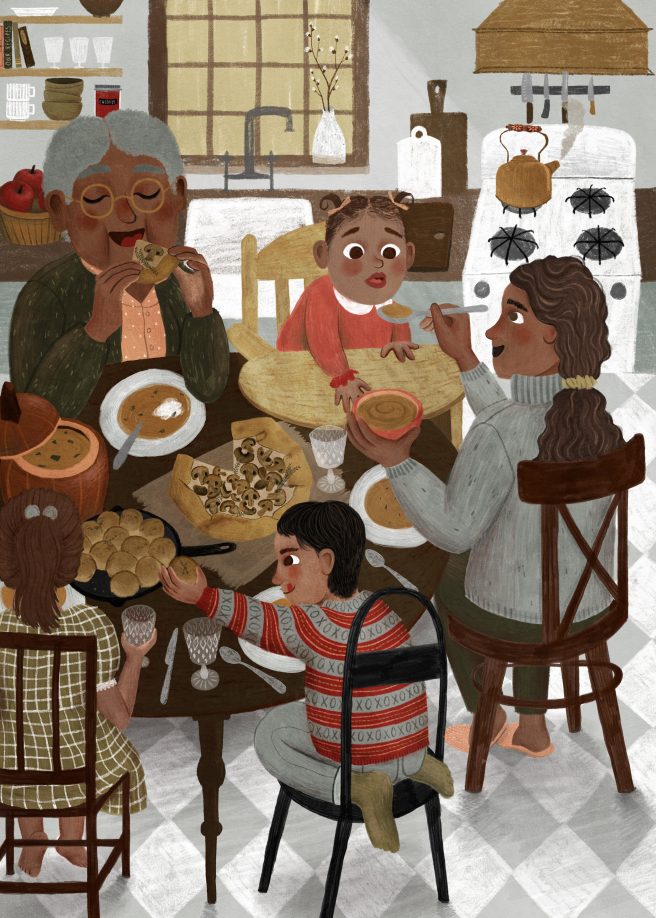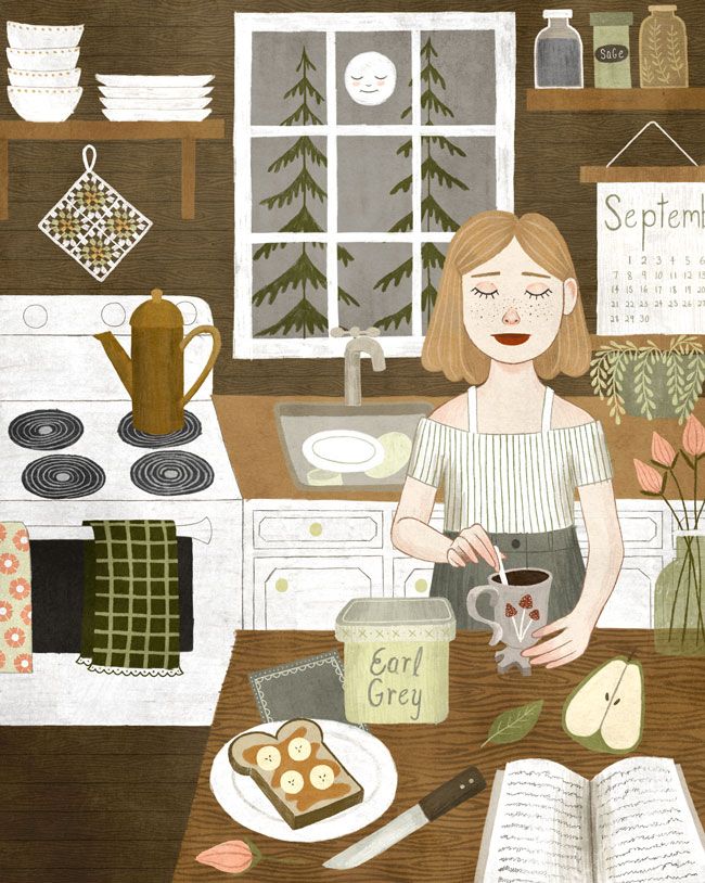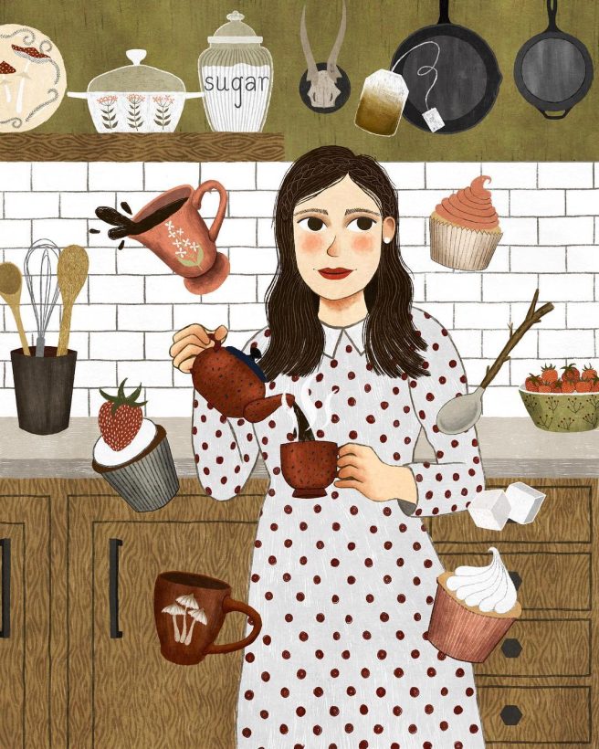 In recent years, her work has evolved to reflect the joys she’s discovered while living on her own. Being surrounded by personal treasures — vintage books, a KitchenAid mixer (she loves to bake!), and a wooden illustrator’s desk — helps her thrive both personally and professionally.