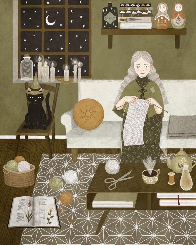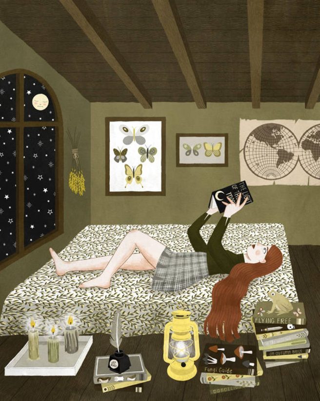Yet alongside these flights of fancy are realistic depictions of simple pleasures such as reading, knitting, yoga, or walking in the woods on starlit nights.