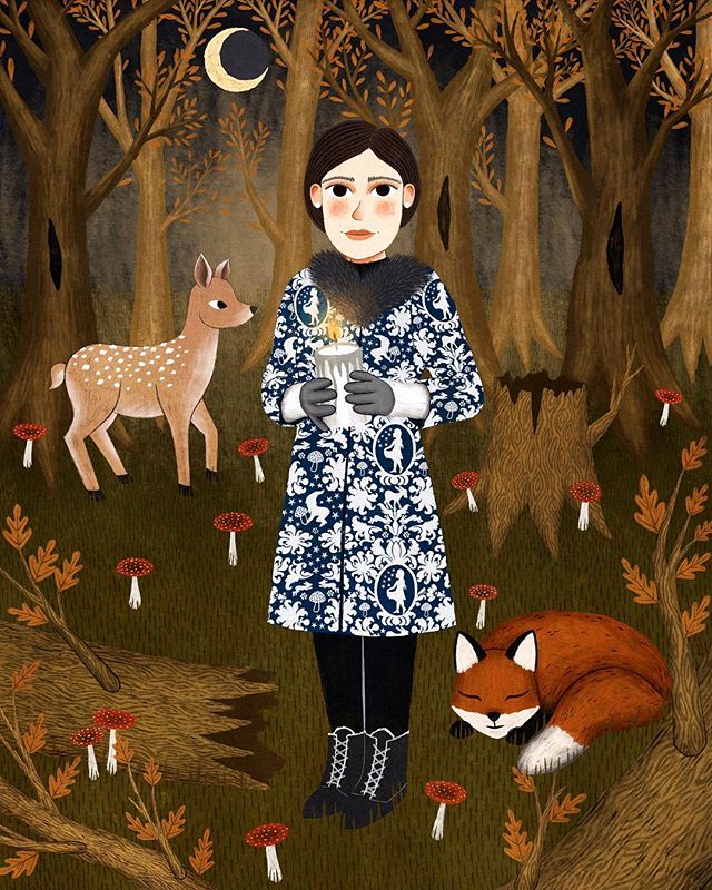 She enjoys drawing new plants and animals as well as inventing new ones. I do like all the foxes, deer, mushrooms, and books in her pictures, and enjoy the sense of calm she creates, especially when showing people indoors, safe and warm, on wintry days.