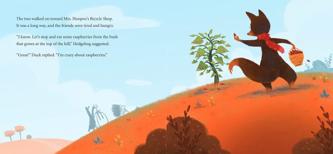 Duck is understandably grumpy, but Hedgehog imagines Mrs. Fox might have picked the berries to share with friends. Finally, at Mrs. Bird’s Bicycle Shop, Duck and Hedgehog catch up with Cat, Mr. Billy Goat and Mrs. Fox.