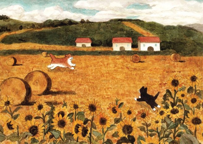 Duck and Hedgehog wheel their broken bicycles to Mrs. Hoopoe’s Bicycle Shop to their flat tires fixed. Suddenly, Cat whizzes past them on her motorcycle, leaving Duck and Hedgehog choking on clouds of dust. Duck is annoyed, but Hedgehog suggests that maybe Cat is rushing off to see her injured sister.