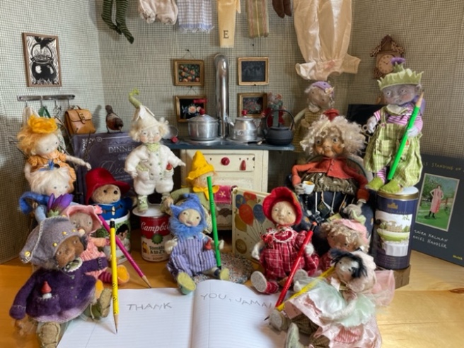 🌺 BONUS COOL THING: Children’s book illustrator Jane Dyer, who won our September Bundle of Joy Giveaway, recently sent me a special thank you photo showing her handmade needle-felted dolls posing with all the goodies. That’s Elderflower (red jacket) seated to the left of the Downton Abbey tea tin. She and the Blossom Babies have gathered for a special tea party (I spy Snowdrop, Hellebore, and Hyacinth, among others, all with AS pencils!). Don’t you love Elderflower’s kitchen? And check out the artsyletters “Raven and Cauldron” notecard hanging on the wall, too. 🙂