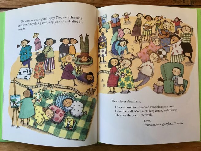 Like my real life aunts and the aunts in Linda Lee’s poem, Truman’s aunts were game for all kinds of fun activities: kite flying, bubble blowing, dancing, singing, roller skating.