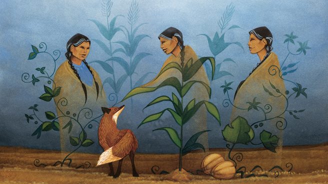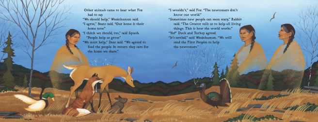 Along with their animal friends (Deer, Duck, Turkey, Rabbit), the three plant sisters agreed to help the newcomers despite Fox’s skepticism. Rabbit reminded him that “The Creator tells us to help all living things. This is how the world works.”
