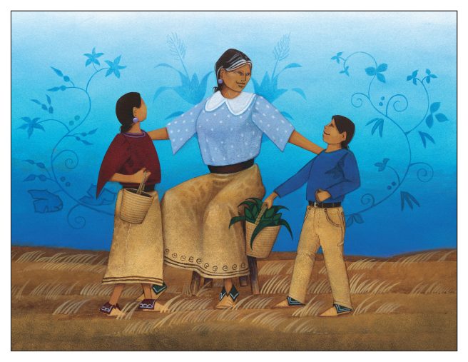 We first hear a conversation between a contemporary Wampanoag grandmother, N8hkumuhs (NOO-kuh-mus), and her grandchildren Maple and Quill. They are curious to learn how Weeâchumun, the Guardian Spirit of Corn, asked their ancestors to help the Pilgrims.