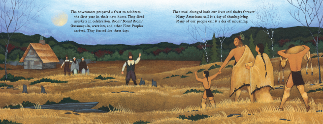 The authors have struck a nice balance in telling this story – emphasizing the kindness and compassion of the Wampanoag people, yet sparing the youngest readers from the travesties that subsequently occurred. The question of why some Natives consider Thanksgiving a day of mourning may initiate more in-depth discussions among older readers about the consequences of colonization. Rather than reading a glossed-over version of the hard truths surrounding this account, they can be introduced to them in an age appropriate manner.