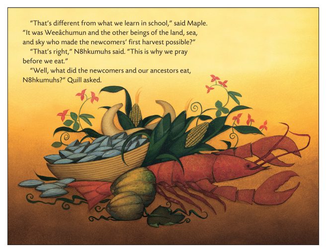 N8hkumuhs finishes her tale by saying, “That meal changed both our lives and theirs forever. Many Americans call it a day of thanksgiving. Many of our people call it a day of mourning.” Maple notes that the story was different from what they had learned in school. She hadn’t realized it was Weeâchumun and “other beings of the land, sea, and sky” who had made the newcomers’ first harvest possible.