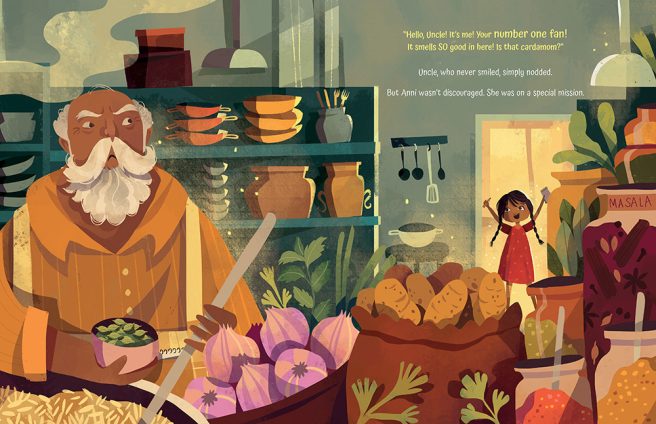 Love how she captures the spirit and vitality of Indian culture as well as the love of food traditions as they’re passed down through the generations. There are wonderful scenes of Anni and Uncle working in their own kitchens, with an abundance of ingredients (ginger, onions, chilies, potatoes, cilantro, mint) dancing across the pages.