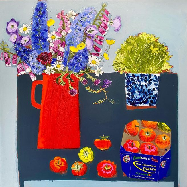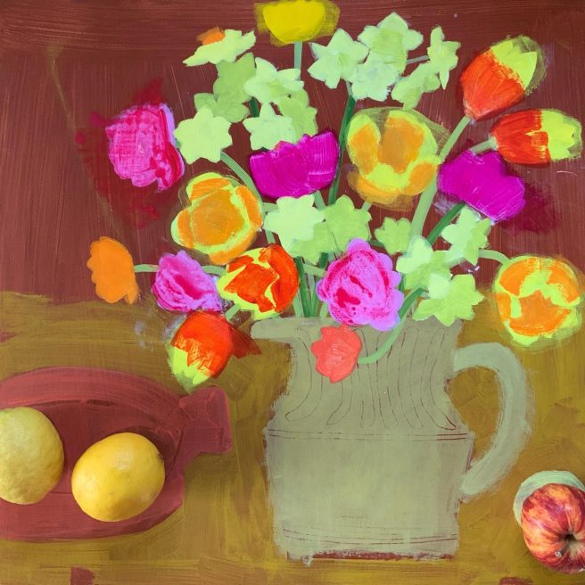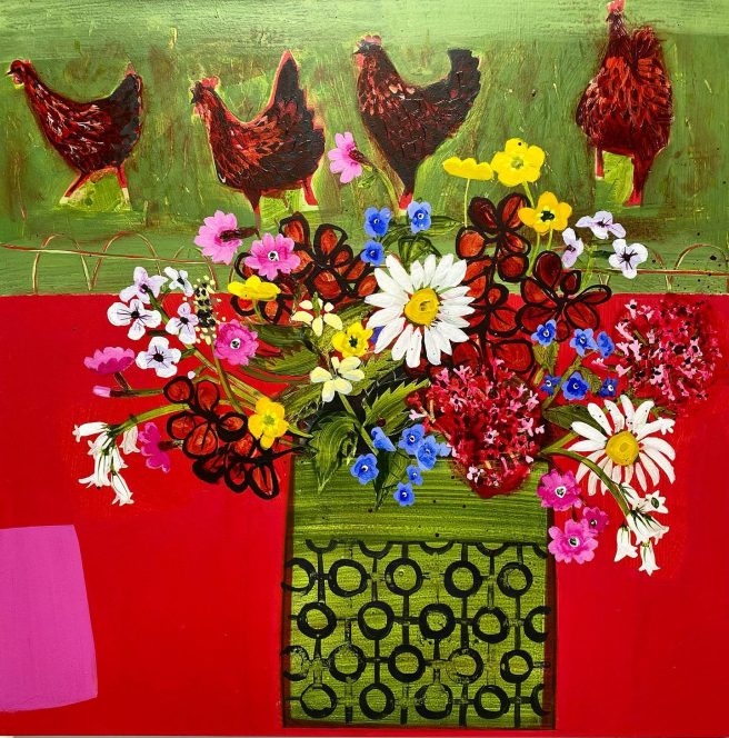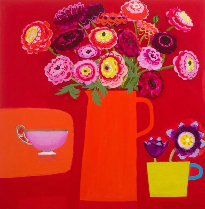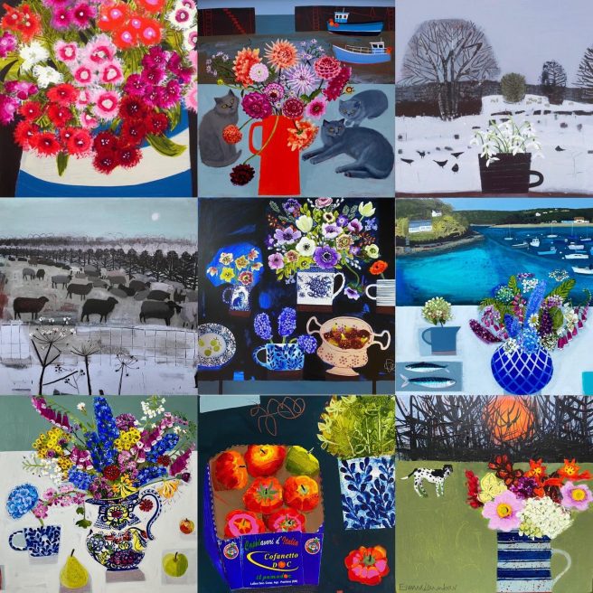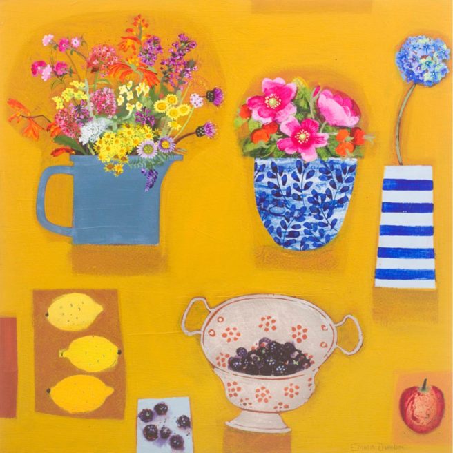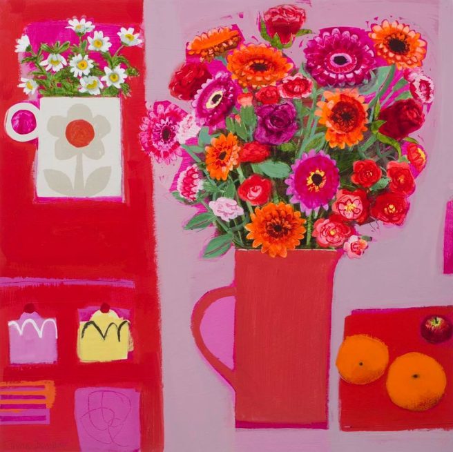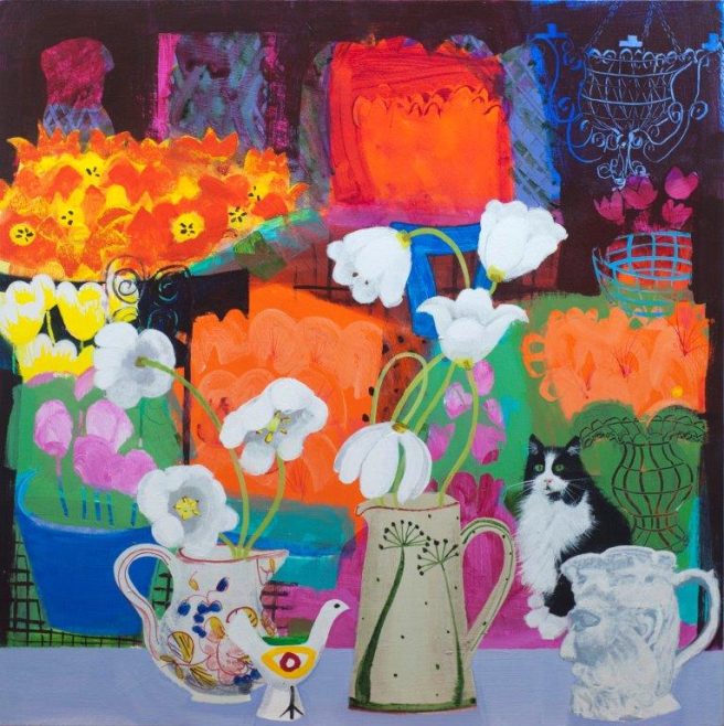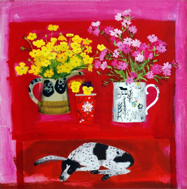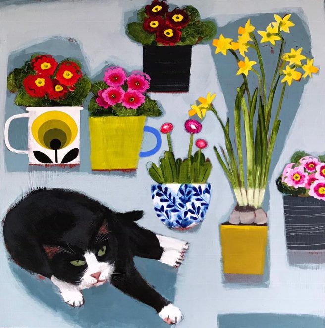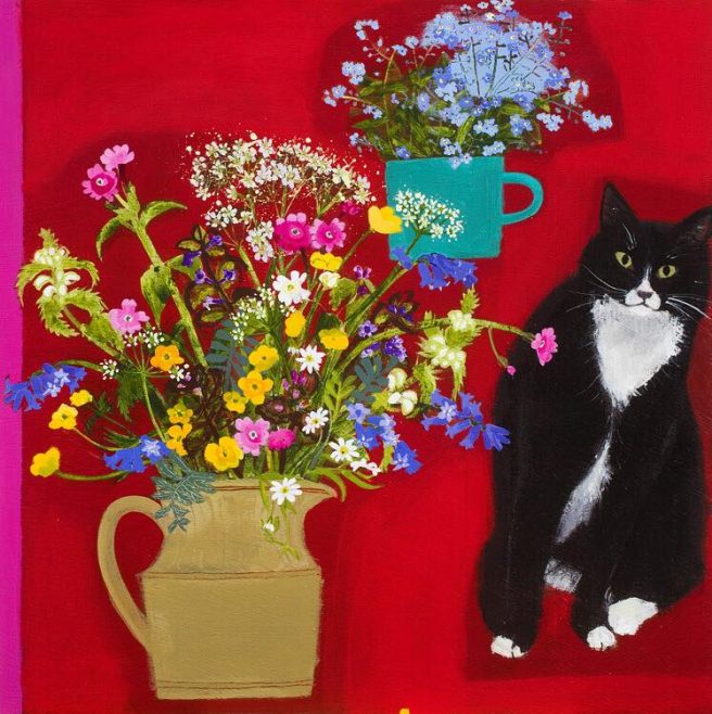 You have introduced me to yet another UK artist that I LOVE! I looked through these paintings multiple times. What a delight her work is! I adore her flowers and how some are almost abstract in the back with blocks of paint with detailed flowers and vase in the front. One painting has MY cats in it! Seriously I have two tuxedo cats — one with a white blaze and one with a black face! Love the cats she painted with the flowers and the dog. I’m off to check out her website as well as the artists that inspired her. Thanks for the introduction to Emma Dunbar!