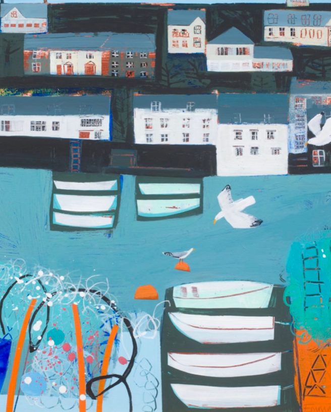 Her influences come from traveling in India, Cornish holidays, and “the chaos of cats and children wandering onto wet paint.”