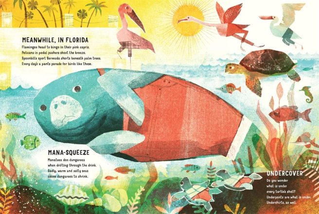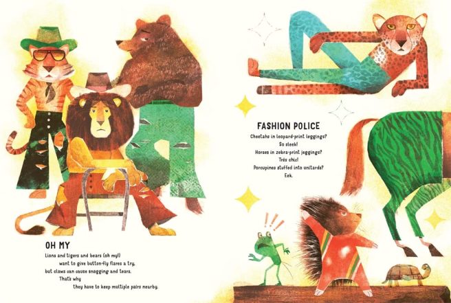 I love how this book is dressed in layers: the deftly crafted, seemingly simple poems feature interesting animals while getting us to really think about different kinds of pants – their various functions, appropriateness for certain activities, and undeniable appeal to certain personalities. Such a clever concept! And of course there’s the sheer joy of reading these verses aloud again and again just for the laughs.