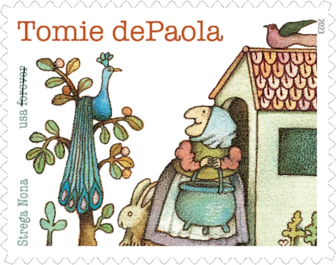 The Forever stamp features the much beloved Strega Nona, the titular character from Tomie’s Newbery Honor winning book published in 1975. Strega Nona was named one of the “Top 100 Picture Books” by School Library Journal. The stamp was designed by art director Derry Noyes with dePaola’s art.